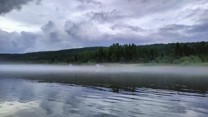 На этот раз я решил попробовать усовершенствовать свое сидячее место на катамаране и водрузил туда свой складной стул. Сидеть стало удобно, но места он занимал слишком много, так что приходилось складывать его, когда я поднимался на ноги для забросов. В один из таких моментов я понял, что стул надо было привязывать, но было уже поздно – после неудачного поворота он нырнул в реку, сразу ушел под катамаран и пропал из виду. Пришлось возвращаться к проверенному ящику. По дороге нам попалась небольшая деревня, и мы заметили привязанный к берегу «кораблик», почти такой же как был у рыбака Жени. Причем тут ловля на него явно была успешной, леска постоянно дергалась, видимо на ней сидела уже не одна приличная рыба. Вскоре снова начался мелкий дождь, и мы облачились в свои дождевики. На реку спустился густой туман.
