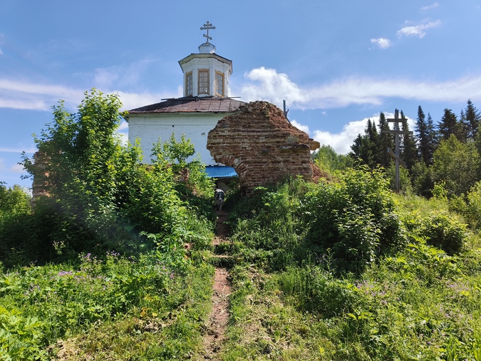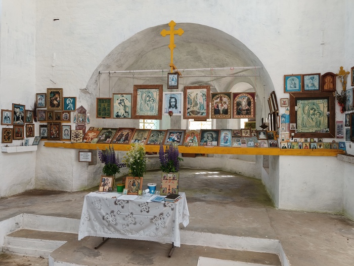 Разрушенная в свое время большевиками церковь уже не функционирует в полном объеме, но медленно и неспешно реставрируется. Около нее строится деревянная часовня, а внутри она вполне прилично отделана и даже присутствуют алтарь и стульчик для хранителя. Правда, во время нашего визита внутри никого не было.