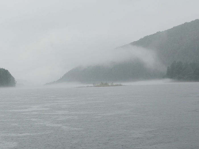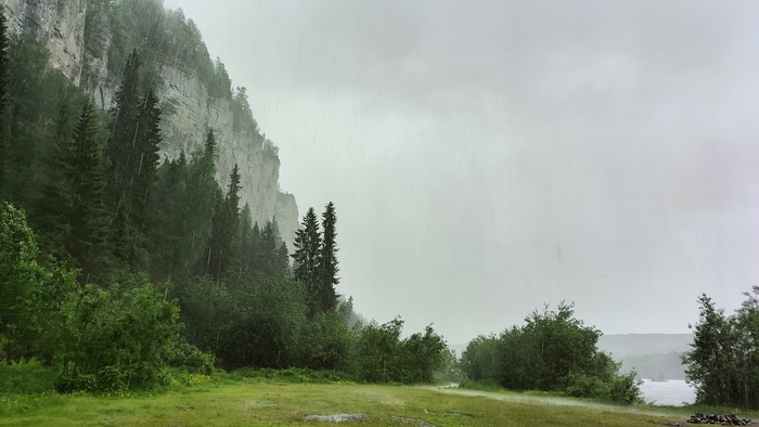 Пока мы кушали, с реки надуло тучи и мы поняли, что грозы не избежать. Бросившись накрывать вещи на катамаранах, моя жена умудрилась уронить в воду сложенный подсак, а прямо у берега было очень активное течение, которое моментально его унесло. Это меня очень расстроило, так как означало крайне малую вероятность вытащить трофейную рыбу, если бы таковая попалась мне на крючок. Не успели мы спрятаться в беседку, пошел очень сильный дождь. Практически вся поляна превратилась в лужу. До начала дождя мимо нас прошло две группы ребят в направлении вершины, и, когда через полчаса дождь закончился, они возвращались мокрые насквозь. Но, к счастью, спустились они без происшествий и теперь весело прыгали по лужам, так как терять им в этом плане было уже нечего.