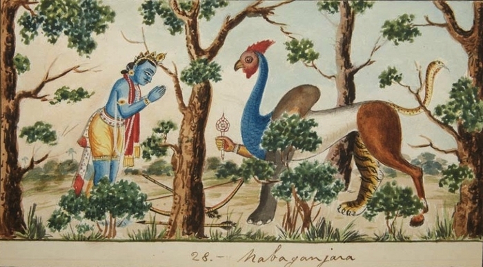 Однажды, во время изгнания Пандавов из царства, когда Арджуна совершал аскезы на холме, Кришна-Вишну предстает перед ним как Навагунджара. Навагунджара имеет голову петуха и стоит на трех ногах - слона, тигра и оленя или лошади; четвертая конечность-поднятая человеческая рука, несущая Лотос или колесо. Зверь имеет шею павлина, спину или горб быка и талию Льва; хвост-змея.
