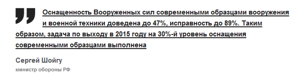 Вооруженные силы РФ на данный момент оснащены современным вооружением и военной техникой на 47%. При этом данный показатель в ВКС составляет 52%, в ВМФ - 39%, в Сухопутных войсках - 35%, а в ВДВ - до 41%. В то же время "ядерная триада" оснащена современным оружием на 55%. Об этом сообщил 11 декабря 2015 года министр обороны Сергей Шойгу на итоговой расширенной коллегии военного ведомства.
