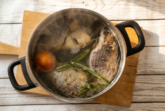Кастрюлю ставим на средний огонь и забываем минут на сорок-пятьдесят. Пену (она будет выделяться бурно, но недолго) обязательно снимаем. По поводу готовности ориентируйтесь на запах: когда бульон приобретет насыщенный рыбный дух - можно выключать огонь. Но нам до этого пока далеко.
