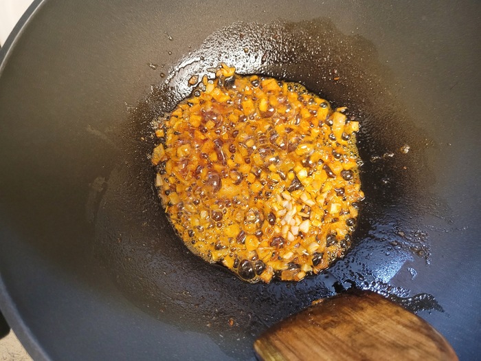 На сковороде разогреть масло,, огонь средний Добавляем мелко нарезанный лук, немного соли, жарим, помешивая, минут 5, потом добавляем томатную пасту, чуть прожариваем, чтобы ушла сырая кислотность. Затем добавляем чеснок и жарим секунд 30, пока не уйдет запах