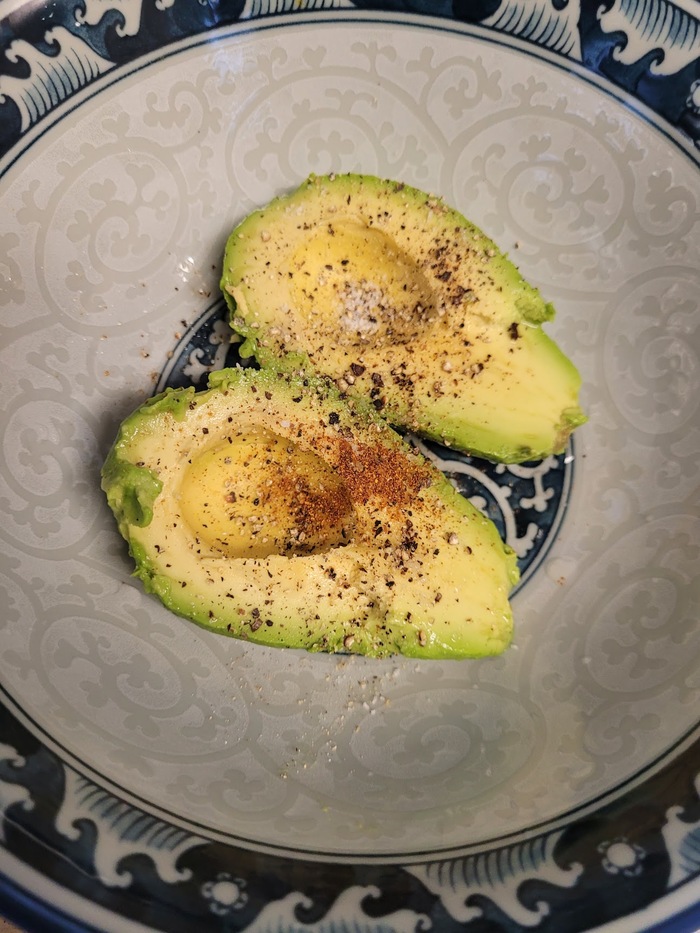 Разрезаем авокадо пополам, убираем косточку., добавляем сок лайма, соль, чёрный перец, красный перец. Разминаем вилкой. Без сока лайма авокадо быстрее темнеет на воздухе.