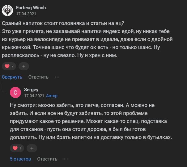 PS: проблема напитков в стаканчиках актуальна аж с 2021 г.: Яндекс.Еда не возвращает деньги за испорченную при доставке позицию — Приёмная на vc.ru