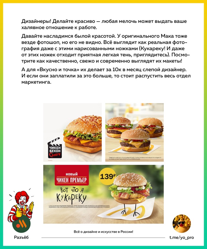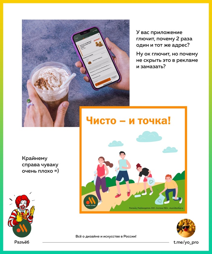Нападаем только на крутых дяденек, которым должно быть стыдно, что деньги тратятся на подобное говно и портят их имидж. Ведь хороший дизайн, стоит не дороже плохого. Недавно я разобрал «Почему дизайн Мака скатился до уровня столовой» на примере экранов в их ресторанах.