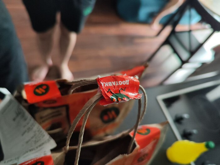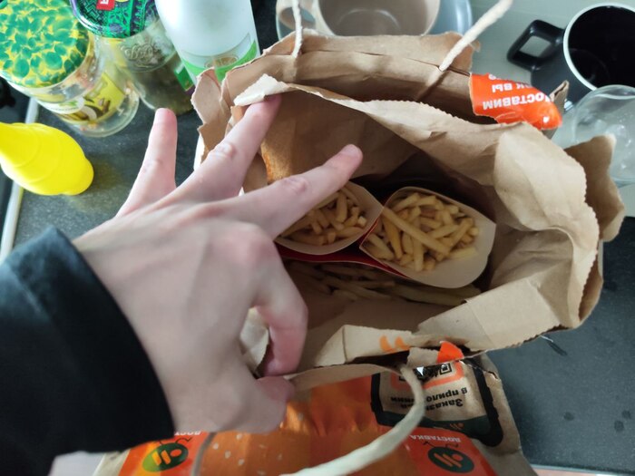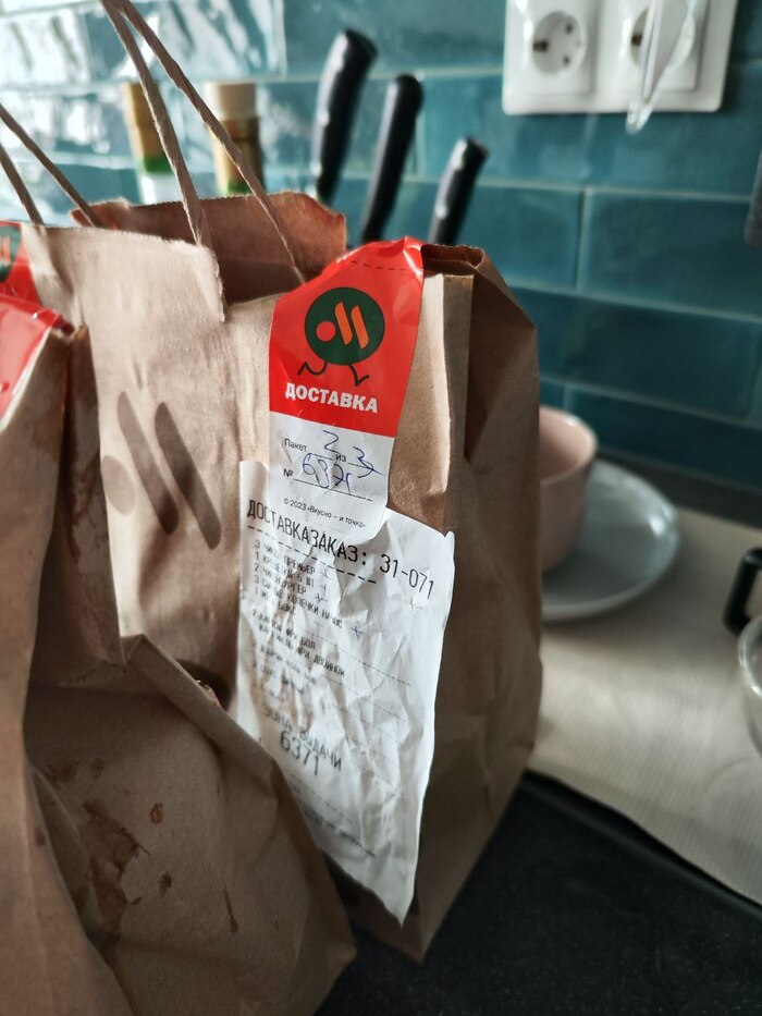 Выйдя на улицу, увидели его же, почему то грязного и странно дышащего, с пакетом в руке, из которого что-то активно текло. К слову держал он его над мусоркой. Заметив нас, он водрузил этот пакет на бортик мусорки и, заглянув в свой желтый рюкзачек, вытащил наш заказ.