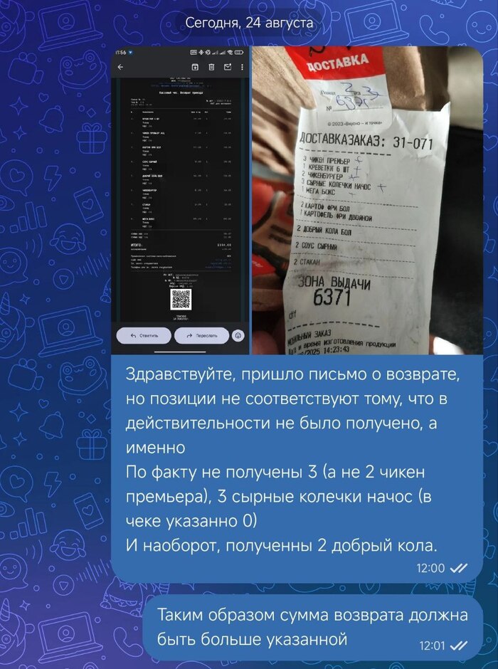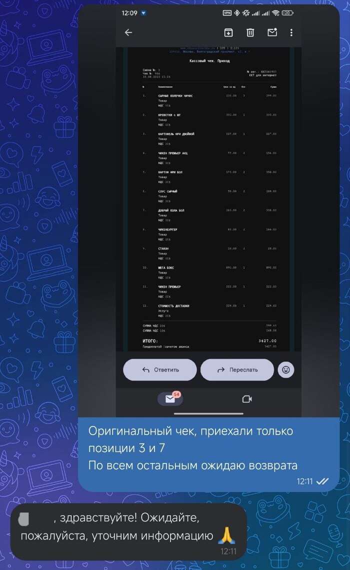 Подождите, но мне же не приехало, все, кроме позиций 3 и 7 из оригинального чека.