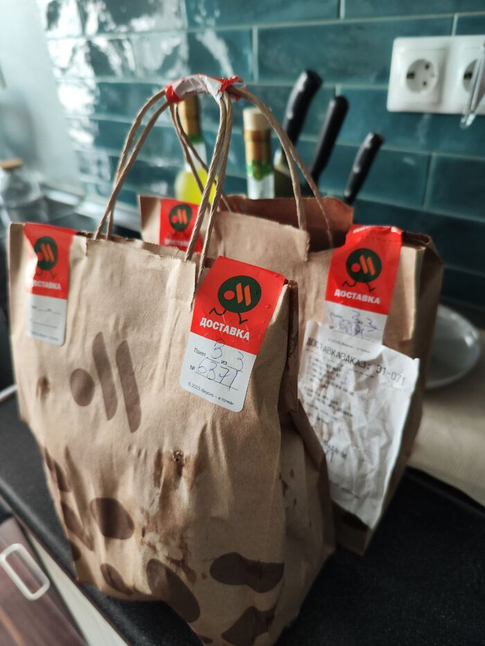 Заказ сразу меня смутил своим объемом, уж больно он был маловат для нашего заказа. А при дальнейшем рассмотрении увидел, что на двух пакетах были наклейки с надписями Пакет 2 из 3 и 3 из 3. На вопрос где в таком случае 1 пакет из 3 курьер ничего не ответил. Держа в одной руке заказ, а в другой курьера, поспешно пытавшегося удалится, звоню в поддержку и сообщаю о том, что заказ не полный. Голос на проводе сказал, что вполне безопасно забрать прибывшие пакеты, а на не прибывший отправить жалобу в поддержку внутри приложения.