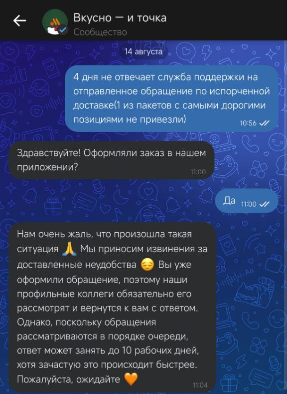 Сегодня только заказ был. Не заказ, а пушка просто. Заказал через их приложение, на компанию, на 2500. Как только заказ был выдан курьеру, то сразу становится доставлен. И всё. Звонок на линию равнозначен нулевому результату. Они сожалеют, у них лапки, они могут дать номер курьера с добавочным, который не работает. Вернуть свои деньги можно только через письменное обращение, срок рассмотрения которого ~48 часов. По итогу получается, что деньги дай, курьер твой заказ скрысит, а ты потом через "очень удобную" форму пытайся вернуть средства, а у них лапки.