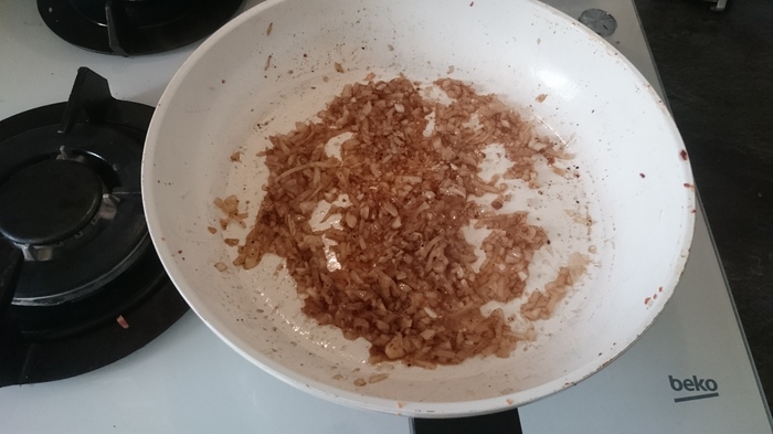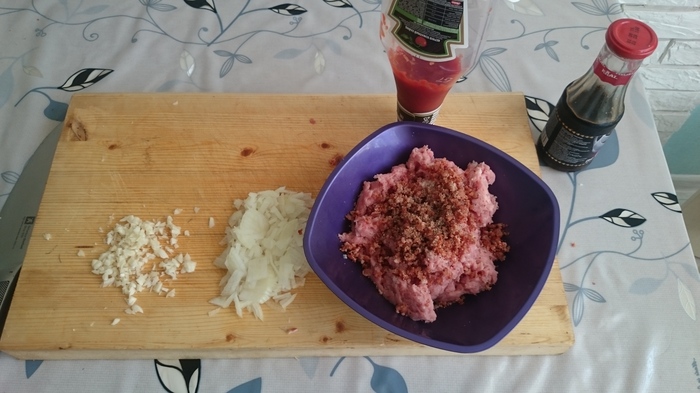 1 луковицу рубим в труху, добавляем в фарш. Также в фарш добавляем сушенные томаты, чеснок, кетчуп, горчицу, табаско, вустерский соус.