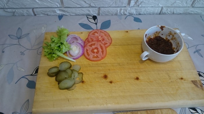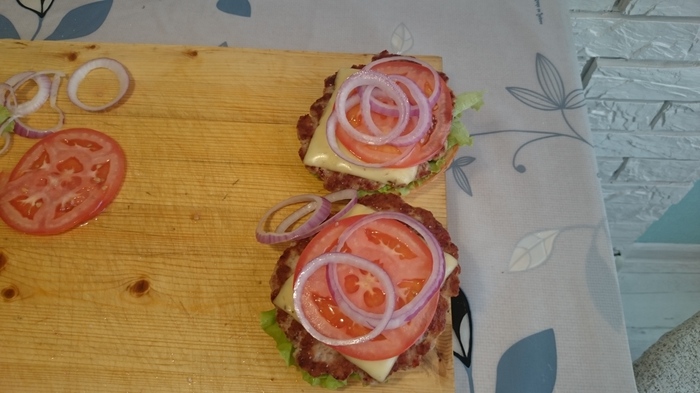 На нижнюю часть булки кладем ингредиенты в следующем порядке: лист салата, котлета с сыром, помидор, соленый огурец, несколько колечек красного лука, соус BBQ и закрываем второй половинкой булочки.
