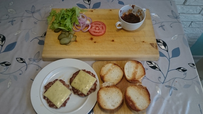 Картошечка и белый соус остались из предыдущих постов. Себестоимость 1 гамбургера 100 рублей (при наличии в хозяйстве жидкостей: виски, вустер, табаско, уксус).