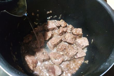 6. К мясу влейте воду, она должна полностью покрыть все кусочки. На первый взгляд может показаться, что воды много, но впереди долгое тушение и много воды выпарится в этом процессе.