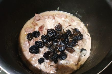8. К мясу добавьте чернослив, перемешайте, дождитесь повторного закипания и оставьте томиться на слабом огне в течение полутора часов. Периодически поглядывайте на готовящееся блюдо, перемешивайте, проверяйте не выпарилась ли вся вода и при необходимости долейте.
