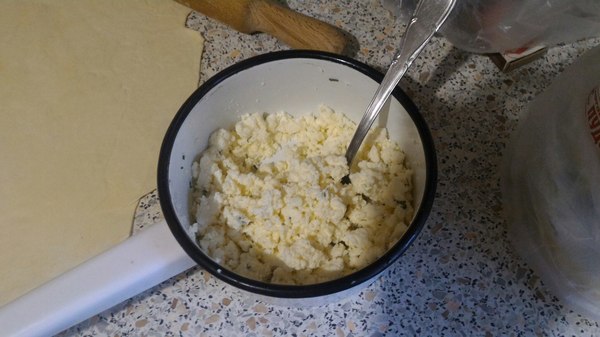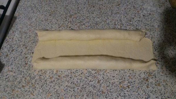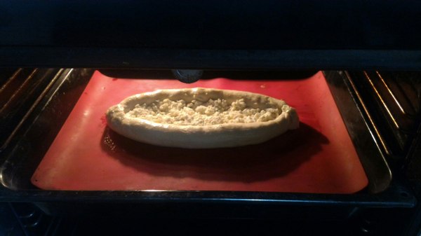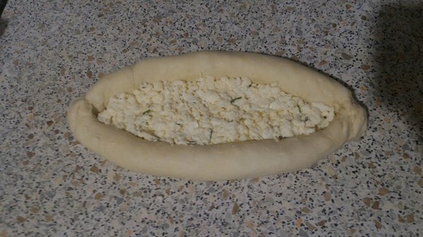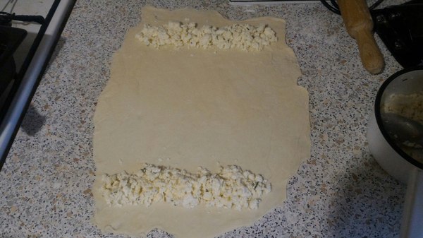 Далее скрепляем края, образуя "лодочку" и заполняем ее остатками брынзы. Если вы хотите длинные наросты на краях, то используйте не прямоугольную форму теста, а расширяющуюся к краям, но я не стал заморачиваться и просто слепил их друг-с-другом, главное сделать так, чтобы крепко держалось, а не то брынза может потечь: