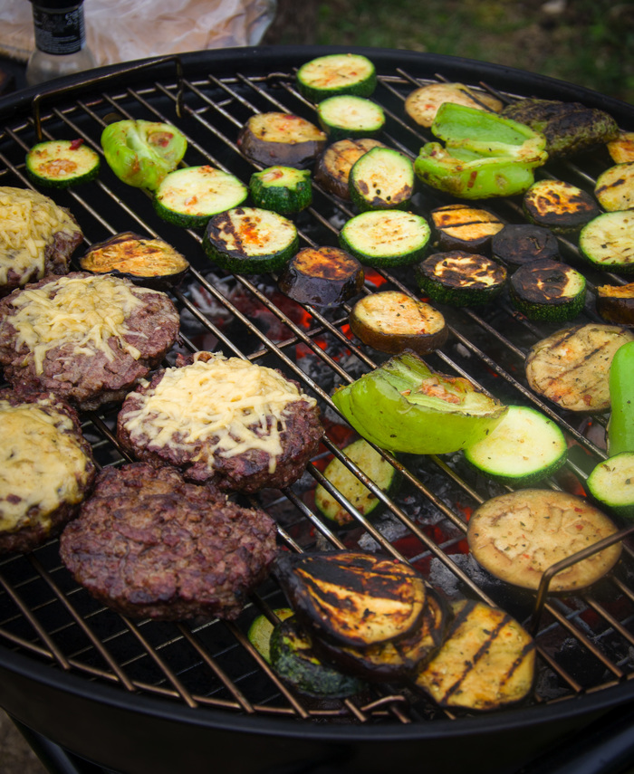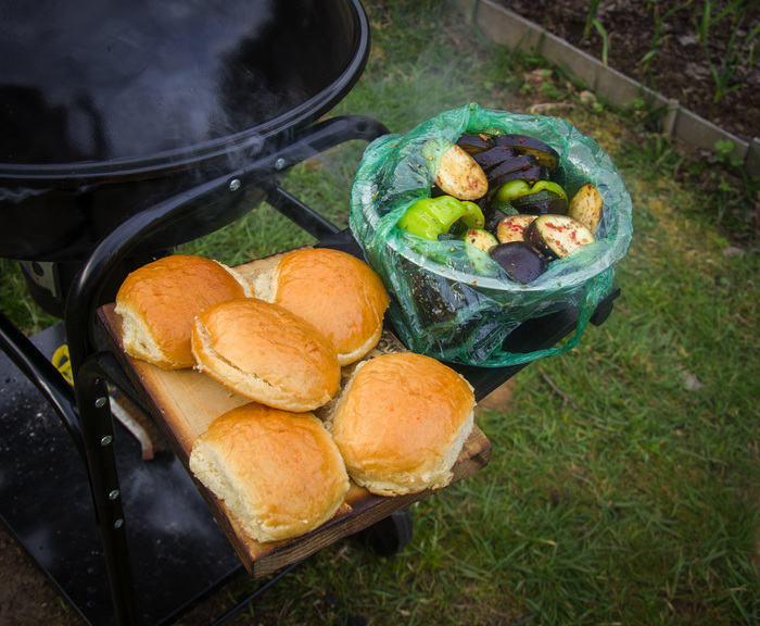 5) Котлеты сдвигаем в сторону непрямого жара и выкладываем овощи на гриль. Я обычно кладу в 2 раза больше чем надо, потому что постоянно роняю овощи в угли. По этой же причине играю на гитаре без медиатора. Овощи также жарим по паре минут под крышкой. Заслонки все открыты.