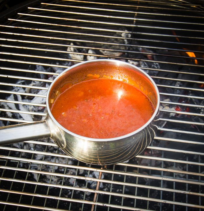2) Пока булки остывают, на оставшихся углях сделаем соус. Нарезанный лук закинем в кастрюльку, чуть обжарим, просто чтобы размягчился и дал сок. Добавим специи, сахар, кетчуп, и пиво. Все хорошо размешаем, доведем до кипения, снимем с прямого жара и добавим секретный ингредиент - щепки на угли (у меня грушевые) и закрываем гриль, пусть соус коптится и томится в течении получаса. Все задвижки закрыть, чтобы чуть-чуть щелочка оставалась. Есть побочный эффект, кастрюлька пожелтеет.