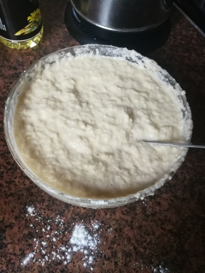 Дальше добавляем муку и соль. Муки ушло 4 ст. ложки с большой горкой. Но тут регулируем, в зависимости от массы, бывает более жидкая, бывает менее. Соль по вкусу, пробую просто тесто