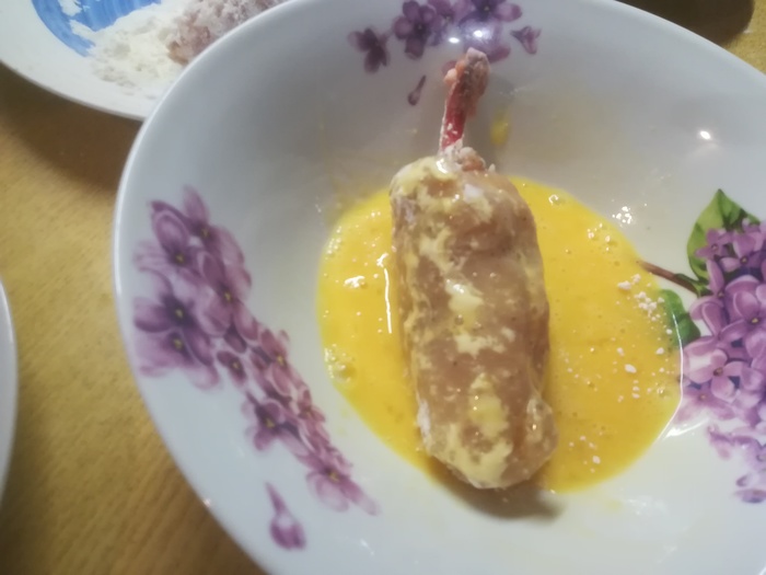 Сначала наливаем масло в глубокую сковородку, чтобы оно успело разогреться. Масло, для начала нужно завернуть рулетом в малое филе, а потом в большое, но как я уже говорил, увлекся, и потому малое филе у меня разорвалось, потому масло кладу на бескостный конец большого. Завернув в первый слой мяса, подворачиваем боковые края вовнутрь, а затем полностью формируем котлету.