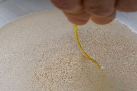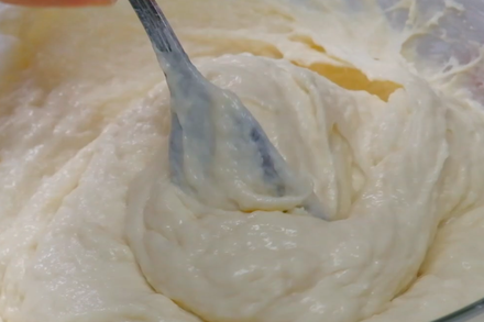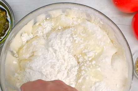 3. Добавить 2/3 мучной смеси и перемешать до максимальной однородности. После этого накрыть миску с получившимся тестом полотенцем и оставить при комнатной температуре на 2 часа. За это время тесто увеличится в размерах.