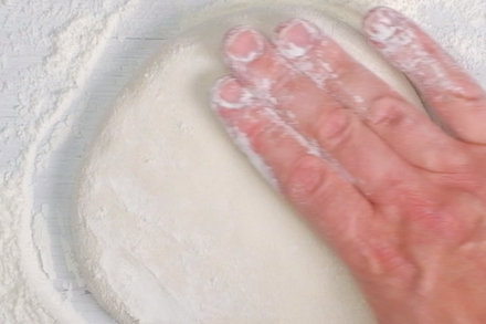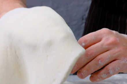 9. Теперь поднять тесто внешней стороной ладони и немного растянуть его, перекладывая с внешней стороны ладони одной руки на другую. Таким образом, мы снова вытягиваем тесто между краями и серединой. Середина остается чуть поплотнее.