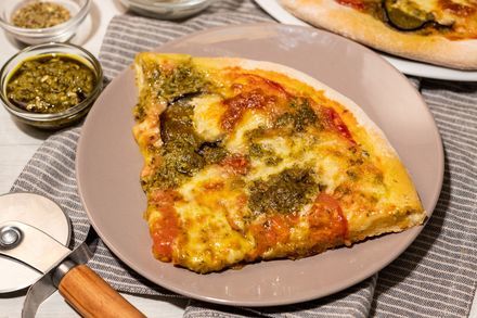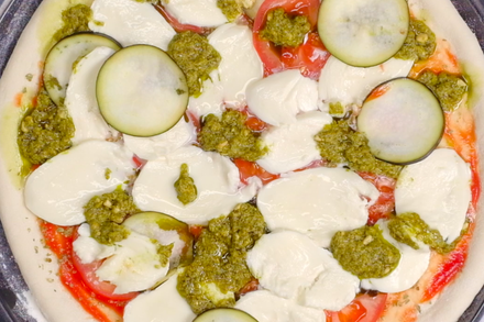 11. Далее приступаем к начинке. Тут можно дать волю фантазии! Я использовала томатную пасту и сыр, так как их кладут на пиццу практически всегда, а также нарезанные кружочками баклажан и помидор, приправу орегано и соус песто.