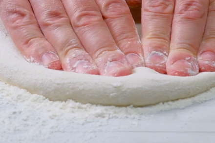 8. Далее нужно положить ладонь одной руки на середину круга из теста, а второй рукой аккуратно потянуть пиццу за края в стороны. Мы делаем это, чтобы придержать самую середину теста от растягивания, чтобы она была совсем немножко толще, так как туда придется основная нагрузка от начинки. А остальное тесто немного растянется.