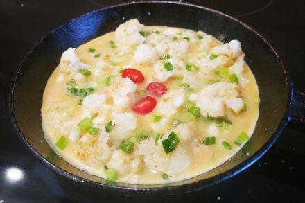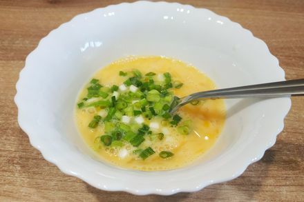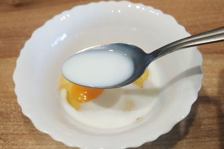 12. Приготовьте кляр. В глубокую тарелку разбейте два куриных яйца, влейте 50 миллилитров молока и посолите.