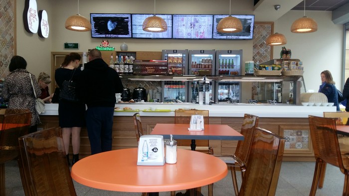 К слову, там очень много мясных блюд, гарниров, десертов и все по абсолютно нормальной цене. Также есть диетические блюда. В кафе приветливый персонал и даже есть табло с информацией о вылетах и прилетах.