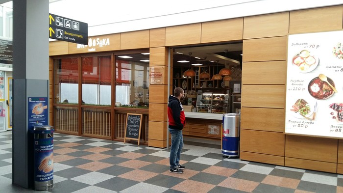 В Пашковском, в зале вылетов, много кафешек и фастфудных заведений. Среди них Air Cafe, Синнабон, Subway, Шоколадница и т.д. Но есть одна "тайная" кафешка в зале прилетов, которая очень радует как ценами, так и ассортиментом. Пройти в нее можно как раз под аркой, отделяющей два зала.