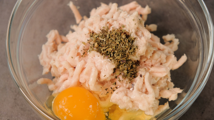 1. Мясо куриной грудки мелко нарезать или пропустить через мясорубку, используя насадку с крупными отверстиями. Измельченное куриное филе посолить, добавить нарезанный лук и, при желании, один-два зубчика чеснока. Вместо репчатого лука подойдет горсть зеленого их также можно использовать одновременно. Пучок свежей зелени тоже будет кстати. С зеленью куриные оладьи будут более вкусными и ароматными.
