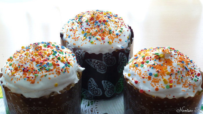 Дадим им остыть, и можно украшать верх куличей глазурью.