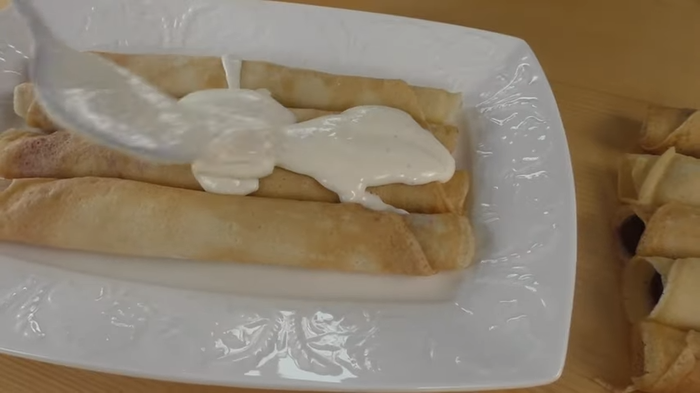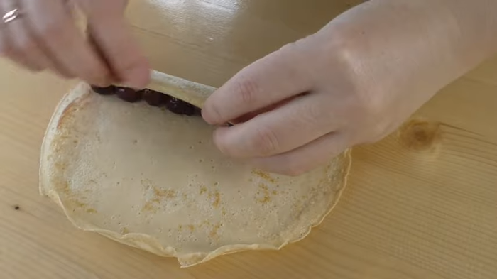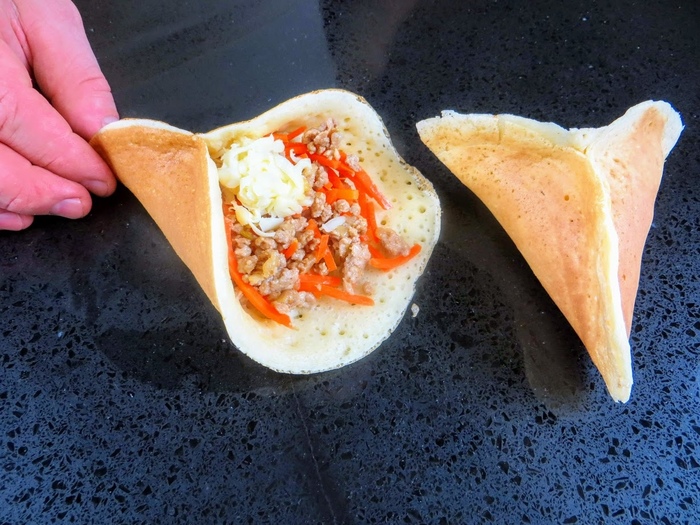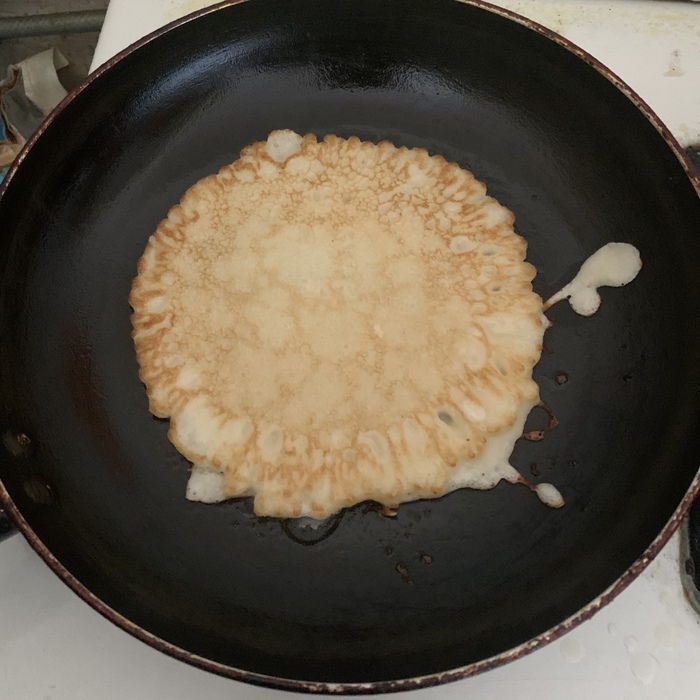 Вышел толстоват, уменьшаю порцию и более активно разливаю на сковороду.