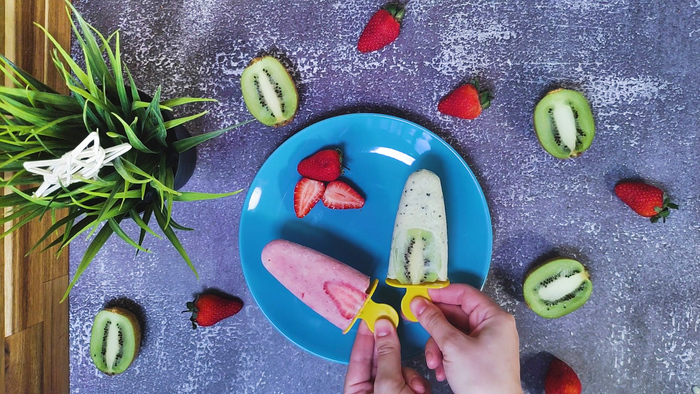 Теперь наше фруктовое пюре наливаем в формочки для мороженого. Я еще в формочку сбоку кладу кусочек фрукта, готовая мороженка так симпатичней смотрится. Формочки я свои купила в Икее, но видела такие и в Fix Price за 100 рублей.