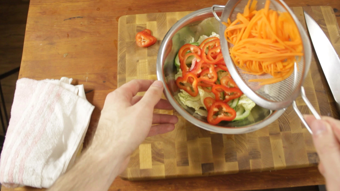 4. Нарезать перец и нарвать пекинскую капусту, смешать все ингредиенты, добавить соль, перец, зелёный лук и перемешать