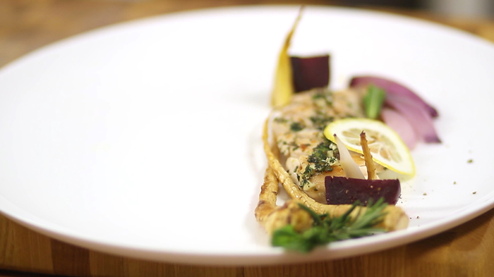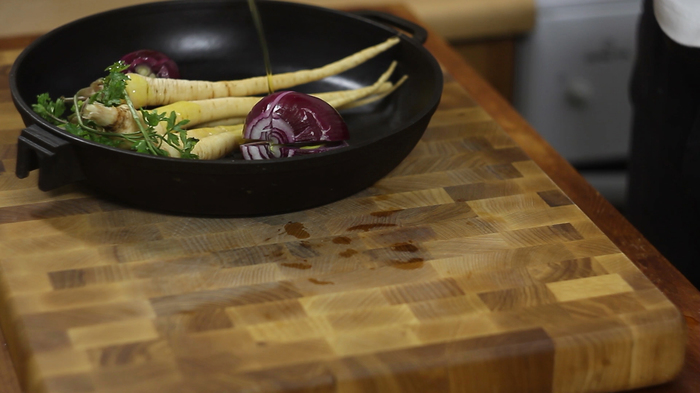 1. Отправить сдобренные оливковым маслом и солью корень петрушки и надрезанный лук в духовку при 200-220С на 30 мин. Свеклу отварить в течении 40 мин.