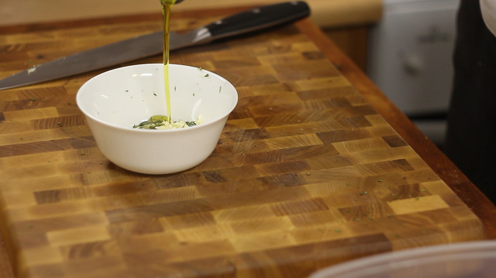 2. Измельчить мяту, розмарин, чеснок, соль и добавить оливковое масло.