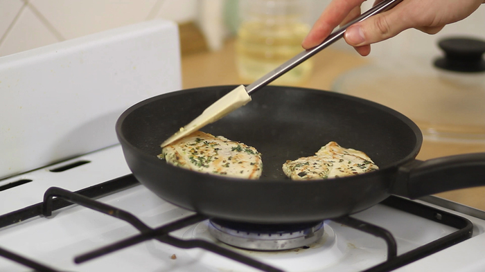Обжариваем под крышкой в течение 4-5 минут с каждой стороны.