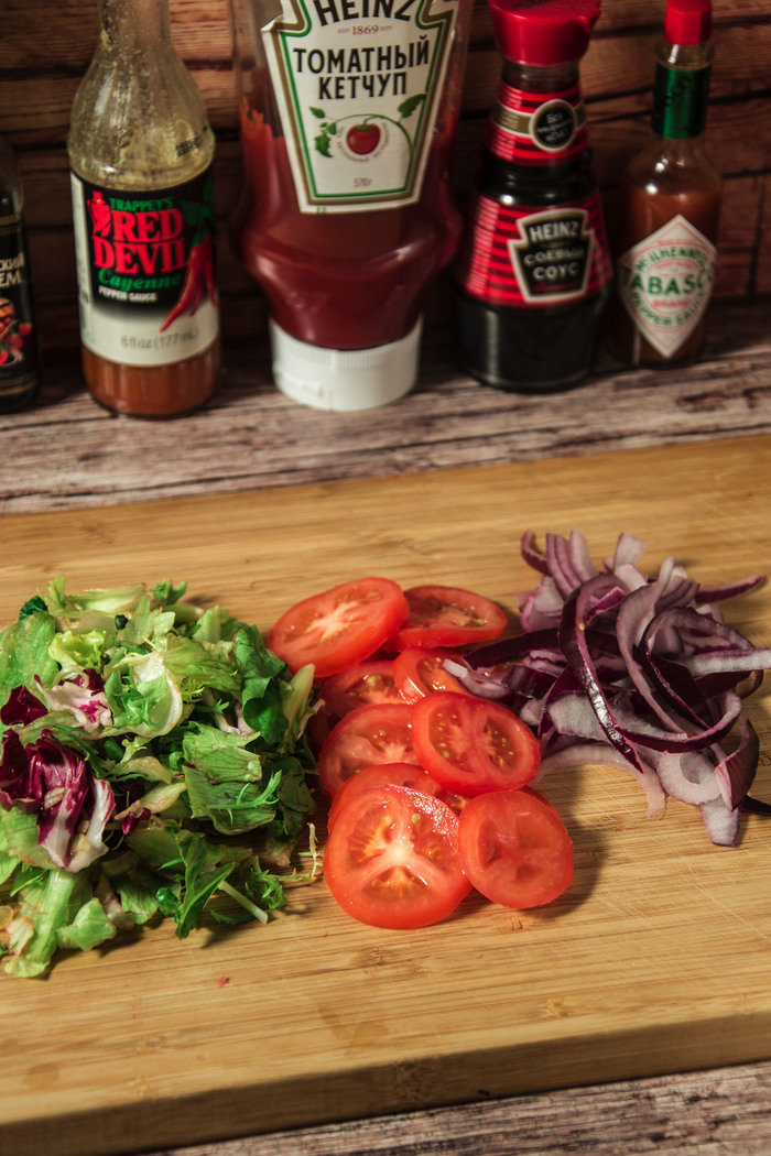 2) Подготовим овощи заранее, дальше придется готовить все довольно быстро. Мы же не хотим есть холодный сэндвич. Увы, бог наградил меня неземной красотой, но обделил аккуратностью, так что лук я нарезал так себе.