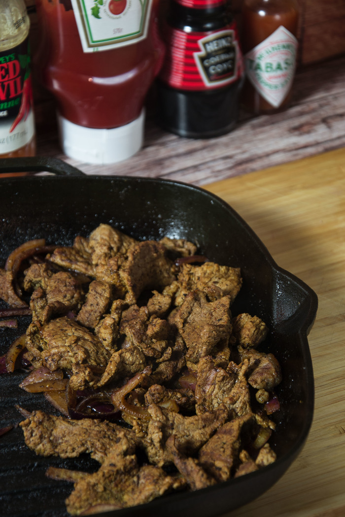 3) Начинаем горячие процедуры. На разогретую сковороду кидаем мясо, обжариваем до корочки. Далее закидываем к мясу лук и специи, я пользовался как раз копченой паприкой и хмели-сунели. Запах на кухне просто невероятный, аж жена прибежала похвалила :) Но ей такое нельзя. Все обжарим до мягкости лука и выключаем огонь, оставляем мясо в сковородке - не должно остыть.