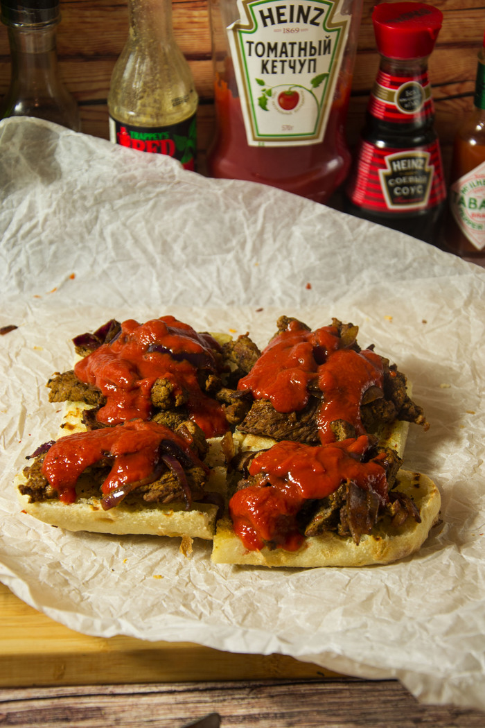 На нижнюю часть лепешки выкладываем мясо и заливаем соусом, это норм, если соус пропитает булку, так в оригинале и задумано. На соус сверху можно налить либо растопленное сливочное масло, либо несладкий йогурт, это все по желанию.