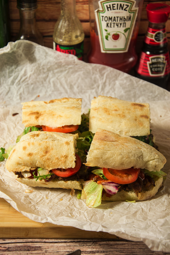 Получилось довольно вкусно! Лично мне напомнило греческий гирос, но без вот этого дзадзики (мне этот соус всё-таки не очень нравится). Особенно хорошо сочетается сладковатый соус и овощи с лимонным соком, получается яркий кисло-сладкий вкус. Мясо по вкусу и аромату действительно как с мангала, я, пожалуй, так стейк теперь попробую сделать. Короче говоря, сэндвичем я доволен, буду его потреблять под сериал "Великолепный век". Должен же я хоть что-то про Османскую империю узнать, а то в гостях стыдно будет :)