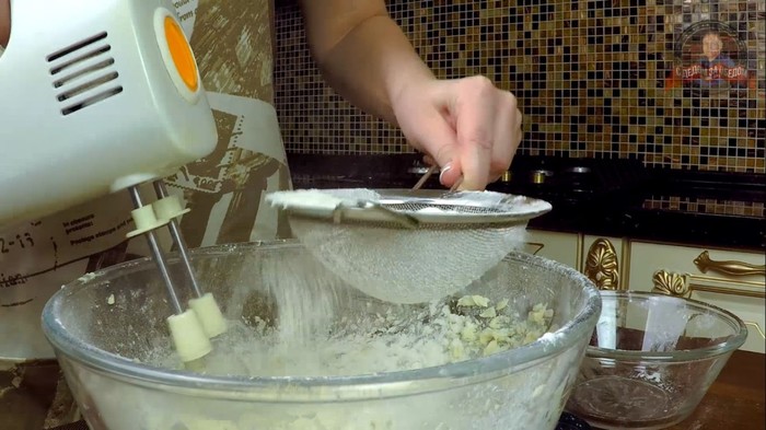 Сливочное масло должно быть холодным. Я на 20 минут положила его в морозилку, так легче будет натирать на терке. Все делаем очень быстро. Обвалять кусок масла в муку и сразу натирать на крупной терке. Затем добавить сахар и перемешать. Песочная крошка готова.