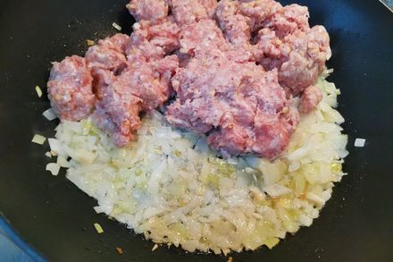 1. В разогретую глубокую сковороду вместе с растительным маслом высыпаем мелко порезанный репчатый лук и обжариваем до прозрачности. Затем в сковороду к луку выкладываем фарш, перемешиваем и немного обжариваем.