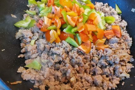 3. Следующим этапом добавляем к мясу порезанный небольшими кубиками болгарский перец. Перемешиваем и жарим 3 минуты под крышкой.