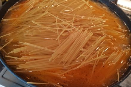 8. Затем вливаем в сковороду горячую воду так, чтобы она закрывала спагетти. Накрываем крышкой и оставляем готовиться на время приготовления спагетти, которое указано на пачке. В среднем 10 минут.