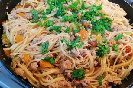 Спагетти с мясом и овощами