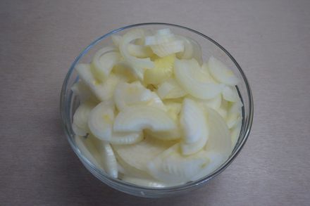 Лук нарежьте полукольцами. Перец тонко нарежьте. Разогрейте сковороду с оливковым маслом, добавьте лук и жарьте на среднем огне 10-12 минут, приправьте солью, черным перцем. Выньте из сковороды.