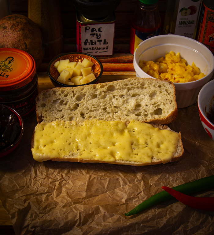 3) Теперь займемся багетом. Разрежем на 2 части, на одну из них положим сыр и отправим хлеб в духовку, не на долго, только чтобы сыр расплавился. Я обычно ставлю решетку на самую верхнюю полку в духовке, включаю верхний обогрев на полную ну и достаточно минут пяти, чтобы все подготовилось.